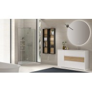 Riva-Sockel H.87 cm mit 2 Schubladen + 1 Korb + Mattweiß A01 und natürliches Sablé. Linke Tür mit weißem Joy-Griff H.87 x B.147 x T.45 cm • Riva-Sockel LED – Weiße ML-Tecnotek-Platte mit integriertem Waschbecken Rechteck 60 x 31 – B.147,8 x T.45,5 x Dicke 1,2 cm • Runder hinterleuchteter Spiegel Ø 120 cm – Lampe Urban