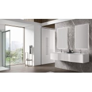 Geformter Waschbeckenunterschrank mit 1 Schublade, H.35 DX – Weiß glänzend B01, H.35 x B.105 x T.50/56 cm • Geformte Platte aus weiß glänzendem Mineraltek mit integriertem Waschbecken Sun 65x32 – B.210,6 x T.56,5 x Dicke 1,2 cm • Spiegel mit LED-Hintergrundbeleuchtung, H.110 x B.70 cm