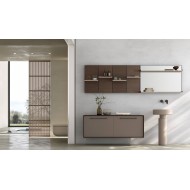 Meuble bas en version contiguë avec 1 panier H.50 cm - Boue Mat A43 avec poignée en métal noir H.50 x L.70 x P.50 cm • Panneau latéral de remplissage Suite pour meubles bas H.50 - Chêne foncé H.52,5 x ép.1,8 x P.52,5 cm • Plateau plaqué Suite en ML Chêne foncé L.144,2 x P.52,5 x ép.1,8 cm • Plateau plaqué Suite en ML utilisé comme panneau sous-socle Chêne foncé L.144,2 x P.52,5 x ép.1,8 cm • Lambris de bibliothèque avec panneau arrière Chêne foncé H.70 x L.35 x P.3 cm • Étagère pour lambris de bibliothèque Sable Mat A42 L.35 x H.3,5 x P.15 cm • Étagère pour lambris de bibliothèque Sable Mat A42 L.105 x H.3,5 x P.15 cm • Vasque céramique sur pied Vigno avec sol Bonde - Matt Sand • Bonde à écoulement libre avec bouchon en céramique Matt Sand