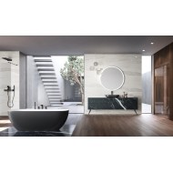 Base vasque 2 tiroirs H.25 cm Marquinia Noir Mat - Ouverture Push&Pull H.50 x L.70 x P.50 cm • Base 2 tiroirs avec vasque intégrée H.25 cm Marquinia Noir Mat - Ouverture Push&Pull H.50 x L.70 x P.50 cm - Panneau latéral rempli de verre - Marquinia Noir Mat H.50 x L.50 x ép. 0,4 cm • Plateau en verre trempé ML Marquinia Noir Mat avec trou pour vasque - L.211,4 x L.50,5 x ép. 0,4 cm • Vasque à poser en céramique Albo 65x39 Noir Mat - Bonde à écoulement libre avec bouchon en céramique Noir Mat - Pieds en métal finition Noir Anthracite Mat - Miroir rond Selfie Touch Ø 110 cm