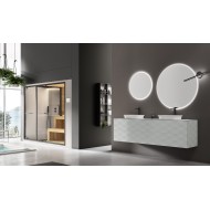 Base lavabo c/2 cassetti H.30 - Bianco Geometrica Opaco apertura “Push & pull” H.60 x L.105 x P.50 cm • Fianco di tamponamento in vetro - Bianco Geometrica Opaco H.60 x L.50 x sp.0,4 cm • Lavabo in appoggio in ceramica Avigo 60x39 Bianco Lucido • Piletta a scarico libero con tappo in ceramica Bianco Lucido - Specchiera Filo lucido retroilluminata Tonda Ø 70 cm - Specchiera Filo lucido retroilluminata Tonda Ø 105 cm - Lampada Urban (4000 K) • Top in vetro temperato al ML Bianco Geometrica Opaco c/foro per lavabo L.211,4 x P.50,5 x sp.0,4 cm