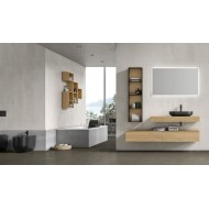 Base in accosto c/1 cassetto H.25 - Sablé Naturale Apertura Push&Pull H.25 x L.90 x P.50 cm • Top in Melaminico al ML Sablé Naturale L.180,6 x P.50,5 x sp.1,8 cm • Top in Melaminico al ML Sablé Naturale c/foro lavabo L.120 x P.50,5 x sp.13 cm • Lavabo in appoggio in ceramica Albo 65x39 Nero Opaco • Piletta a scarico libero con tappo in ceramica Nero Opaco • Modulo a giorno in alluminio nero 3 ripiani fissi c/schiena Sablé Naturale L.35 x H.140 x P.15 cm • Specchiera retroilluminata a Led H.70 x L.120 cm
